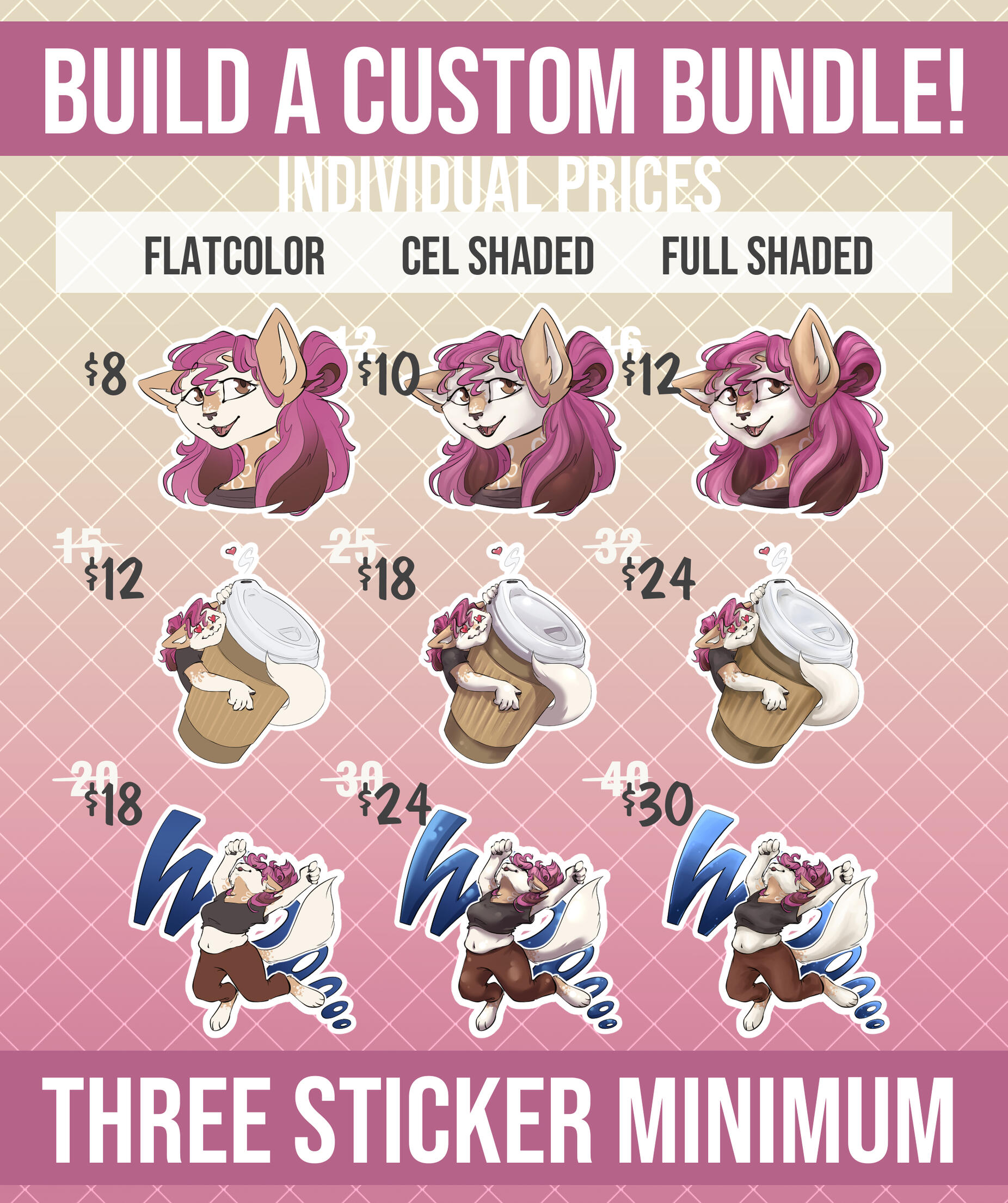 Sticker Bundles are formatted as Telegram sticker packs, sized at 512x512px and come with a pack download link. With the purchase of at least three stickers, my prices are discounted from regular commissions! These packs can be resized to any dimensions and don't have to be used as stickers. A three commission or three character minimum still applies to receive the discounted prices.